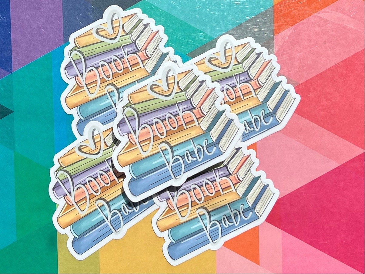 3in vinyl waterproof sticker, of a book stack and the words Book Babe